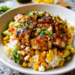 Finally, assemble your bowl by layering the rice, chicken, and street corn topping. Drizzle with a creamy sauce made from yogurt or sour cream mixed with lime juice for an extra zing.